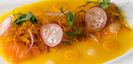 You should start your meal with the Shrimp Ceviche, which has a bright and tangy taste. This dish consists of tiger shrimp marinated in a citrus dressing that is tangy and refreshing. It is the perfect accompaniment to the humid weather of the evening. To provide a contrast to the dish, you can order the Angus Beef Sliders. These sliders have a warm and rich taste with melted cheddar cheese and caramelized onions. The cold and crunchy texture of the ceviche complements the soft and buttery brioche of the beef perfectly. Each bite of the sliders is indulgent, but the ceviche keeps everything light and refreshing.