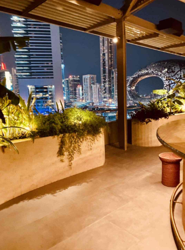 The not-so-secret “hook” for the virality of this location is, naturally, the unobstructed, breathtaking view of the Museum of the Future. While there are other rooftops that provide a view of the skyline, the Monkey Bar places you literally right next to the Arabic calligraphy sign for the Museum of the Future. The result is almost surreal, especially during the “blue hour.” The bar also offers “oversized monkey cages.” While they are literally that, they are also private, partially enclosed spaces made out of rattan and wood, which allow groups of people to lounge in a secluded jungle setting while still feeling the beat of the DJ’s music. The juxtaposition of futuristic architecture and primitive tiki-themed design elements is a visual anomaly that simply cannot be found anywhere else in Dubai.
