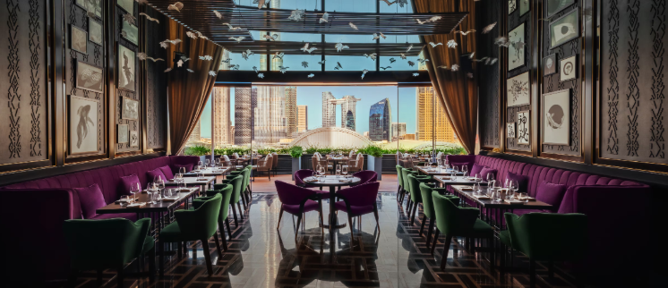 Your adventure starts at the Address Dubai Mall. You have to go to the 12th floor via the elevator to discover this hidden gem. As you step inside, a dark and elegant corridor greets you. The contrast from the bright mall to this cozy area is like a secret.A soft, dim lighting leads you to the main dining area. Then, the room suddenly opens to a place with geometric artworks. The designs are an homage to the ancient Nazca Lines in Peru. Moreover, the floor-to-ceiling windows immediately catch your attention to the skyline. The “feel” is undoubtedly glamorous but not cold.
